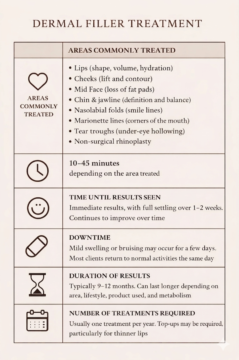 Dermal fillers are a popular, non-surgical treatment which uses hyaluronic acid — a naturally occurring substance in the skin — to restore lost volume, enhance facial features, and improve contour. These injectable gels hydrate the skin from within and smooth and shape areas where collagen has naturally reduced with age.